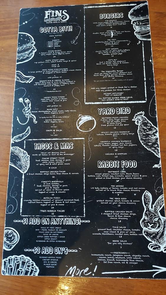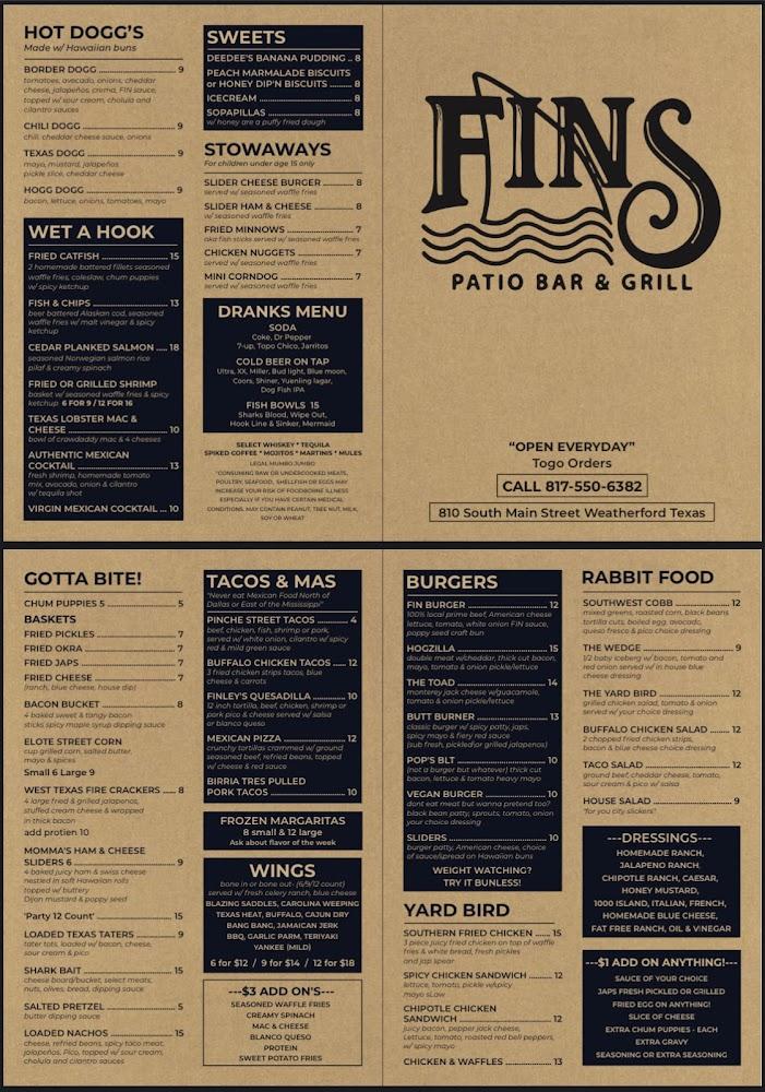 Discover FINS Patio Bar & Grill, the largest patio west of Fort Worth, where great food meets the perfect atmosphere! Open every day of the year, including holidays, FINS offers a diverse menu featuring locally-inspired dishes and a wide selection of cold beers, cocktails, and wines. Enjoy live music, quiz nights, and sports events, all in a welcoming, wheelchair-accessible space. Relish the vibrant ambiance while dining on our spacious patio or inside. With fast service and unbeatable happy hour specials, FINS is the ideal spot for lunch, dinner, or a late-night snack in Weatherford, TX.